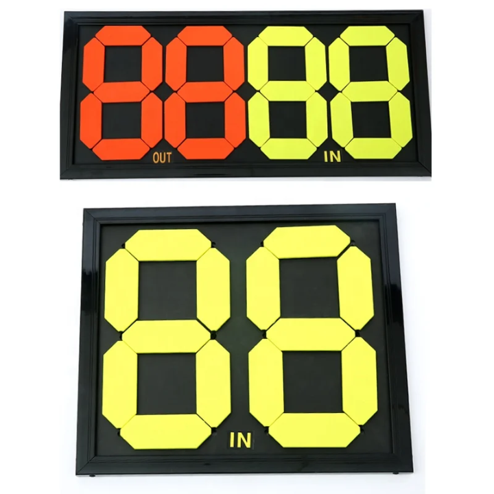 Ensure flawless match organization with this professional 2-digit scoring and substitution board. Featuring large, high-contrast 38cm numbered panels, scores and player numbers are easily visible from anywhere on the pitch. The lightweight yet durable design includes easy-grip handles and a smooth 44cm outer frame for comfortable use by referees and officials. Ideal for football, rugby, hockey, and more, this board provides clear communication with players and spectators. Built for reliability with a secure flipping mechanism, it’s the essential tool for accurate, professional game management at any level.